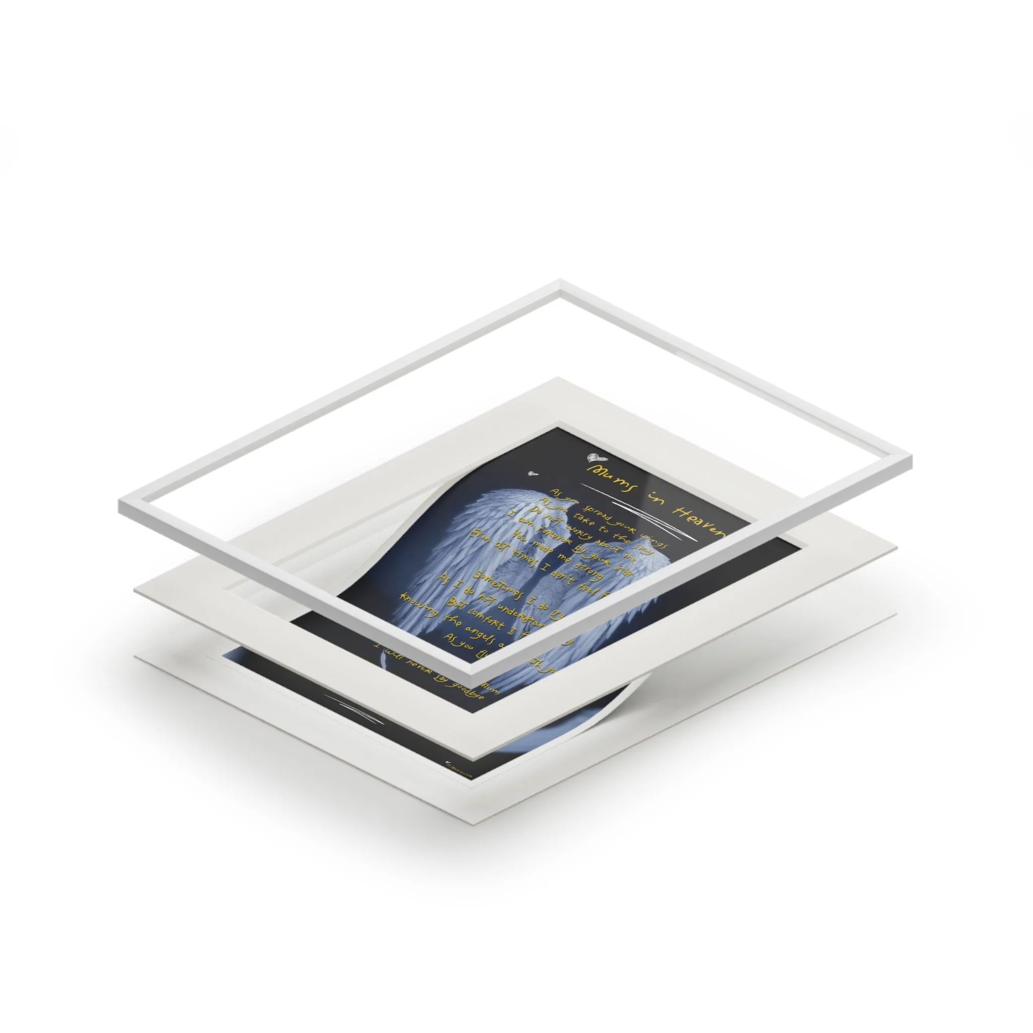 A tender fine art print framed with a crisp natural-white mountboard that gives your chosen artwork room to breathe. The piece is produced as a premium giclée on 175gsm fine art paper, with vivid, lasting color and a textured mountboard window (2mm) that creates a clean, gallery-style presentation. The soft, neutral matte surround highlights the artwork’s details like the luminous wings and handwritten tribute in this design so it reads like a quiet keepsake on any wall. Frame glass is not included; the print arrives protected and ready for gentle assembly into your own frame or display.